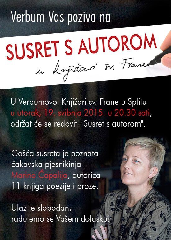 "Susret s autorom", koji se u Verbumovoj Knjižari sv. Frane održava od 2008. godine, prigoda je da se publika upozna s autorima, njihovim opusom, profesionalnim i životnim putom kroz moderirani razgovor, a u ambijentu knjižare ostvaruje se i mogućnost stvarnoga susreta i postavljanja pitanja. U utorak, 19. svibnja Knjižara sv. Frane u Splitu na Trumbićevoj obali 1 bit će mjesto susreta s profesoricom hrvatskog jezika i književnosti Marinom Čapalijom koja živi i radi u Splitu, a koja će ovom prigodom približiti neke od svojih pjesama čitajući ih pred publikom.